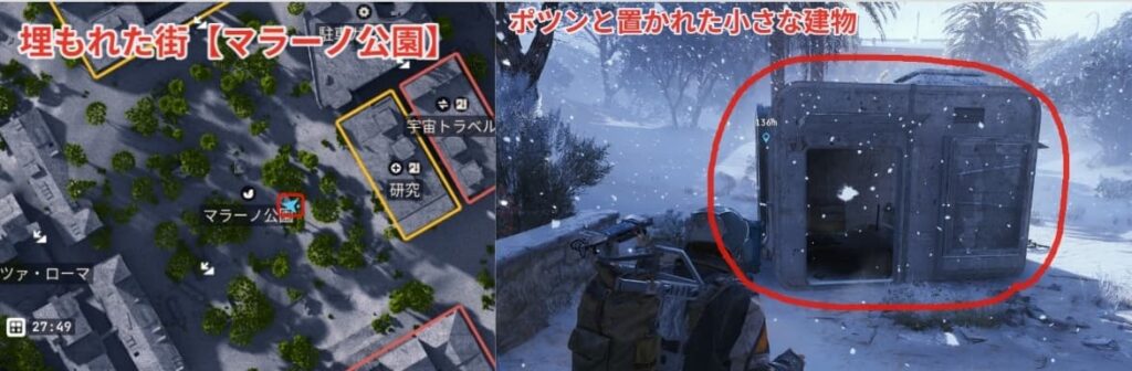 例えば埋もれた街のマラーノ公園にある小さな建物内に雪山があり、寒波を気にせずに回収できます。