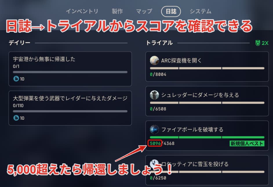 日誌→トライアルから現在のスコアを確認できるので4,000超えたら帰還しましょう!