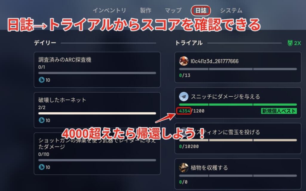 出撃中に日誌→トライアルでスコアを確認できるので4,000超えたら帰還しましょう!