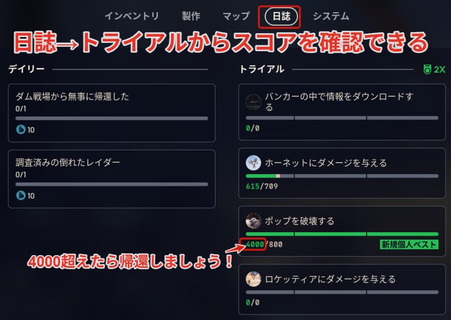 日誌→トライアルから現在のスコアを確認できるので4,000超えたら帰還しましょう!