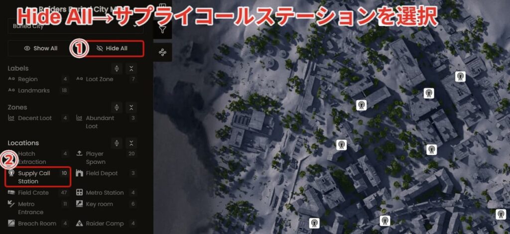 マップ画面に切り替わったら①Hide All→②サプライコールステーションを選ぶと画面に表示されます。