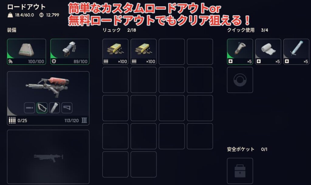 - カスタムor無料ロードアウト:無料ロードアウトでもクリア可能
