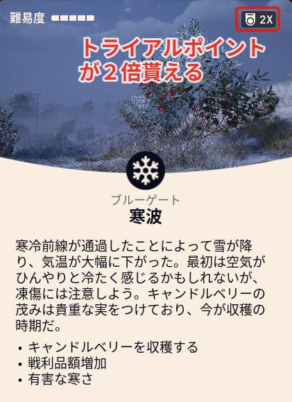 寒波は夜襲や電磁嵐と同じでトライアルポイントが2倍になっています。