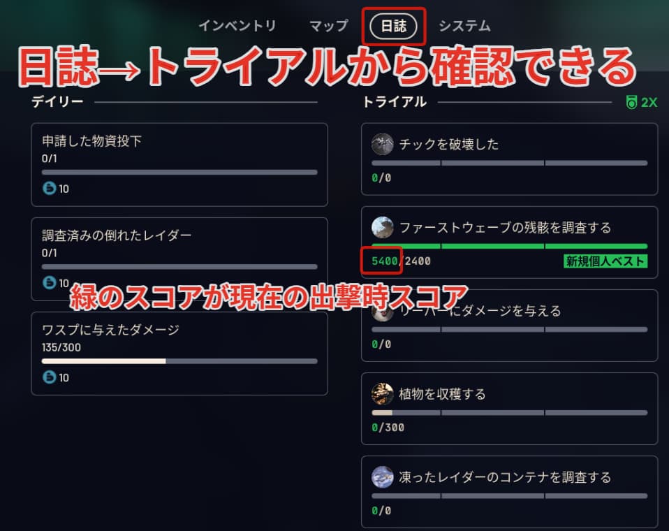 出撃時に日誌→トライアルから現在のスコアを確認できるので、4000超えたらレイダーハッチ等で帰還しましょう!