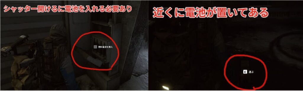 燃料電池を拾って種子保管庫のシャッターを開ける様子