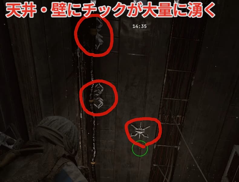種子保管庫の天井・壁にチックが大量に湧くので狩りましょう。