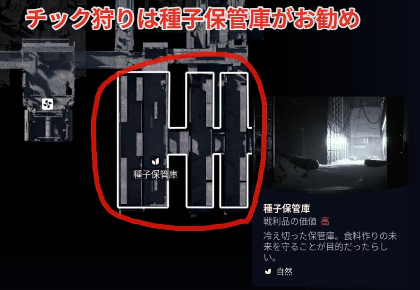 ステラ・モンティスならどこでもチックは湧きますが、特に南東に位置する【種子保管庫】がお勧めです!