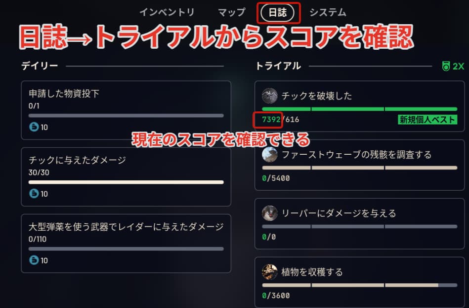 日誌→トライアルから現在のレイド中のスコアが確認できるので4000超えたら帰還しましょう!