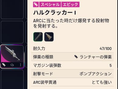 こちらもエピック武器になりますが、対ARC用のハルクラッカーで弱点を撃つと一撃で倒すことができます。