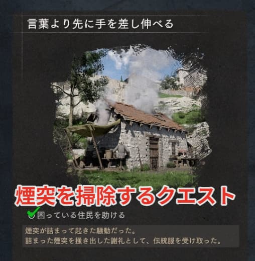 こちらのエルナンド城の伝統服は1つ前に手伝った煙突を掃除するクエストの報酬です!