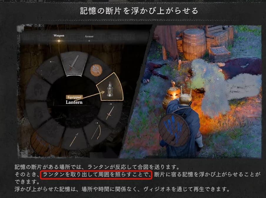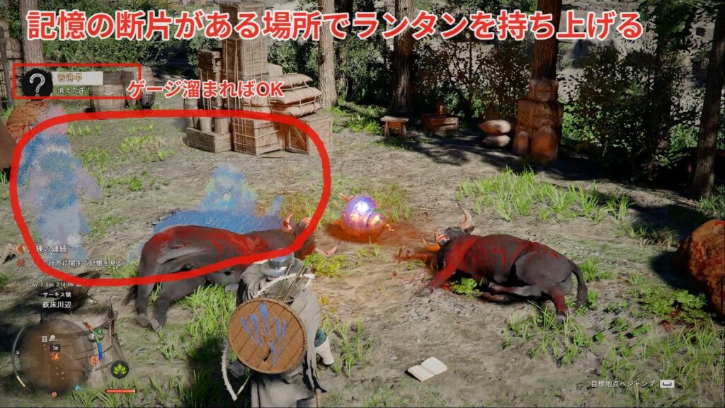 『牛の行方に関する記憶を見る』にはランタンを持ち上げ続けることで記憶の断片が浮かび上がります。