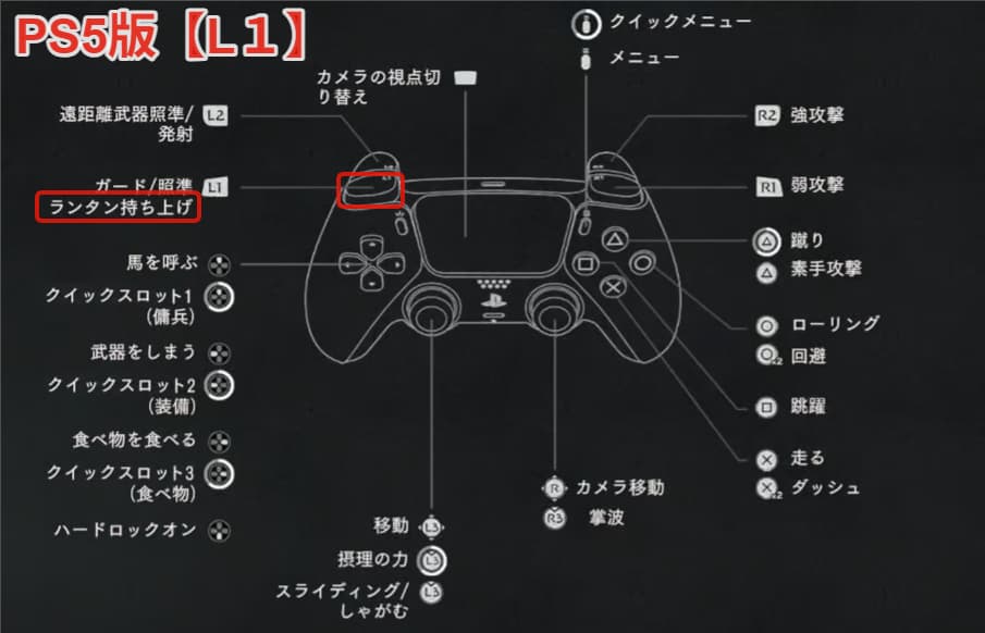 次に操作方法の確認です。PS5版は【L1】にランタン持ち上げが割り当てられています。