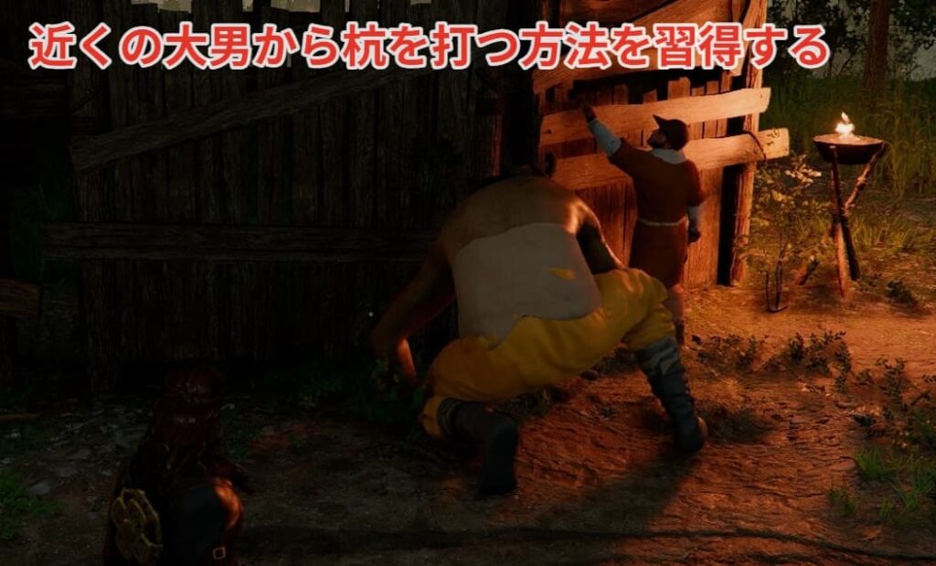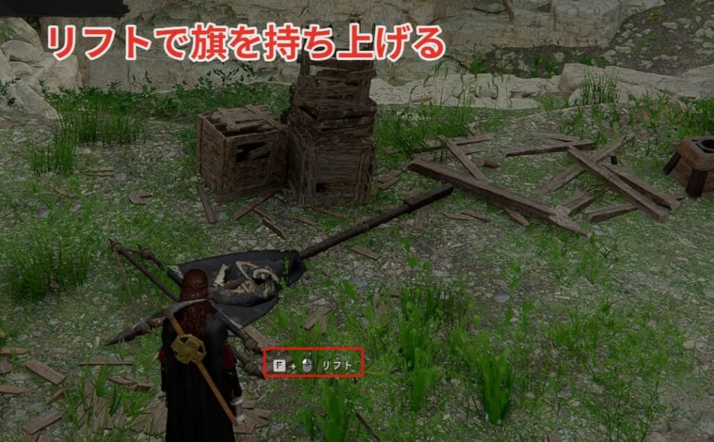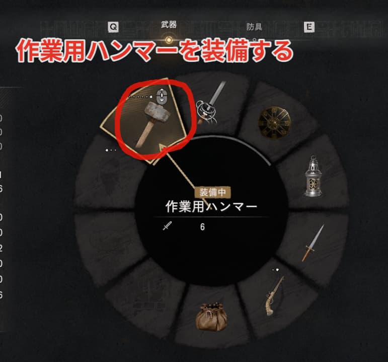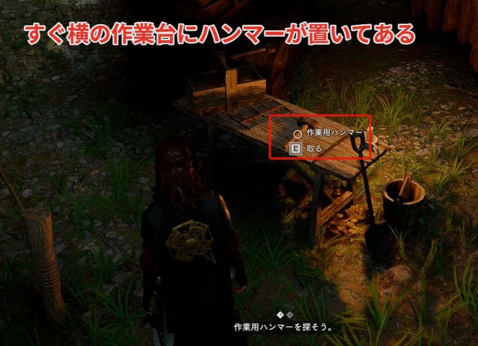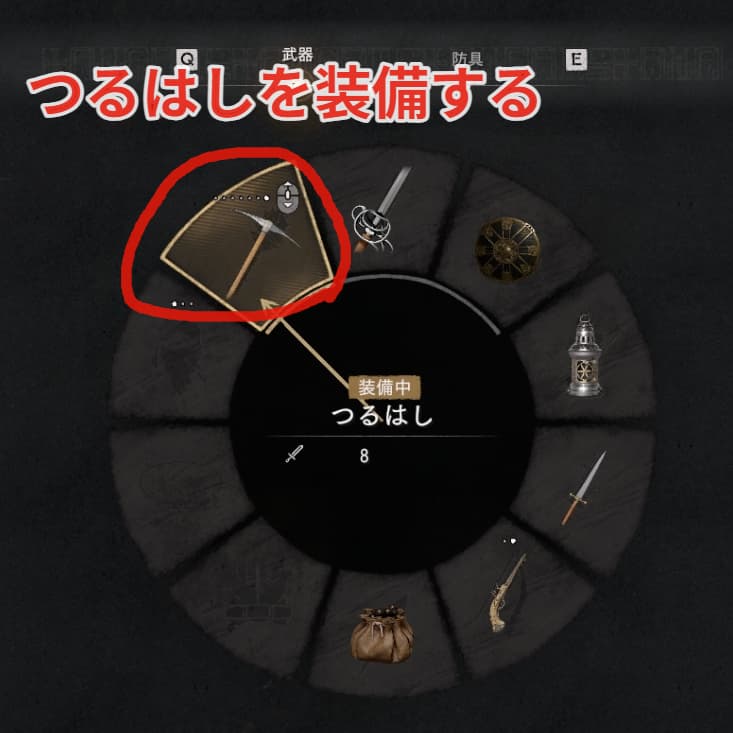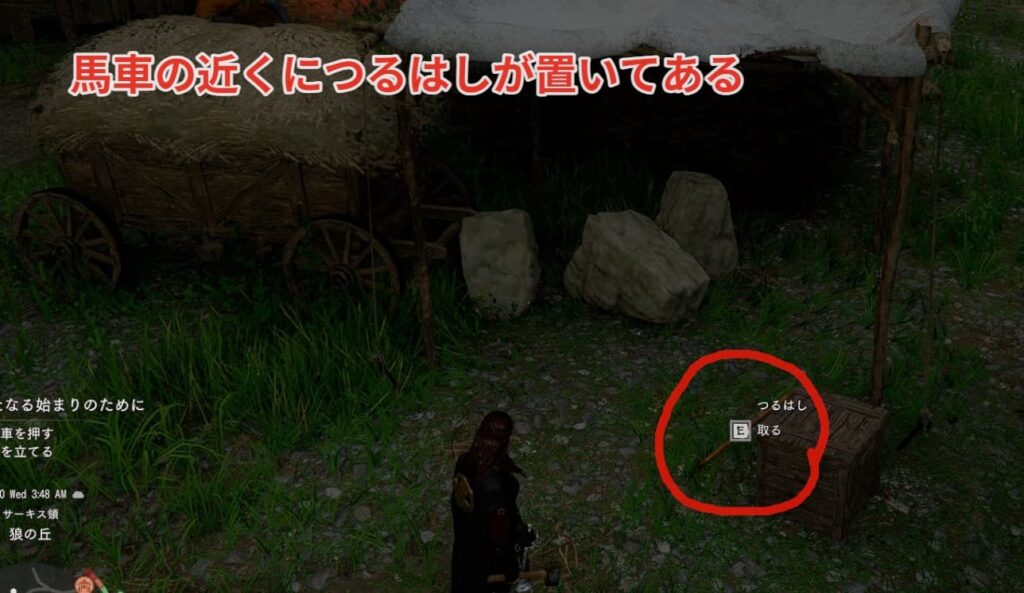 まずは馬車の近くの木箱に置いてあるつるはしを取りましょう。