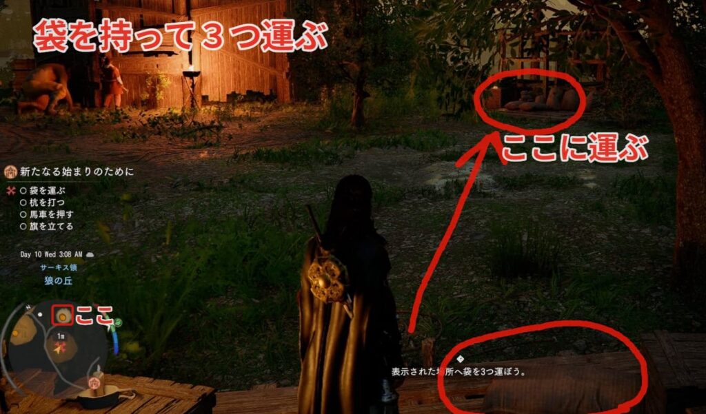 袋を運ぶの指定された場所は小さく黄色くなっているエリアです。