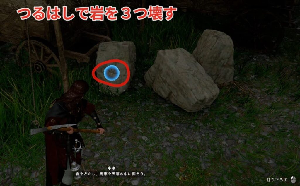 まずはつるはしで天幕内の3つの岩を照準を合わせて壊しましょう。