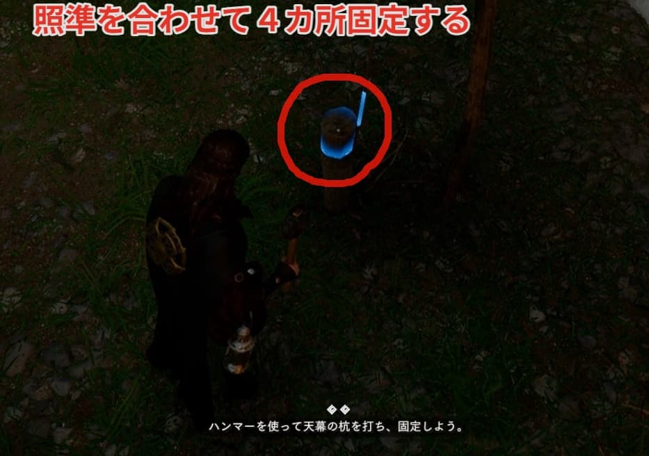 テントの4カ所ある杭を照準を合わせて固定しましょう!1か所で3回打つ必要があります。