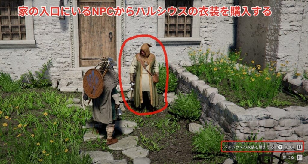 家の入口にいるNPCからハルシウスの衣装を10銀貨で購入できます。