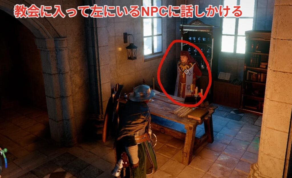 教会に入ってすぐ左にいるNPCに話しかけましょう。