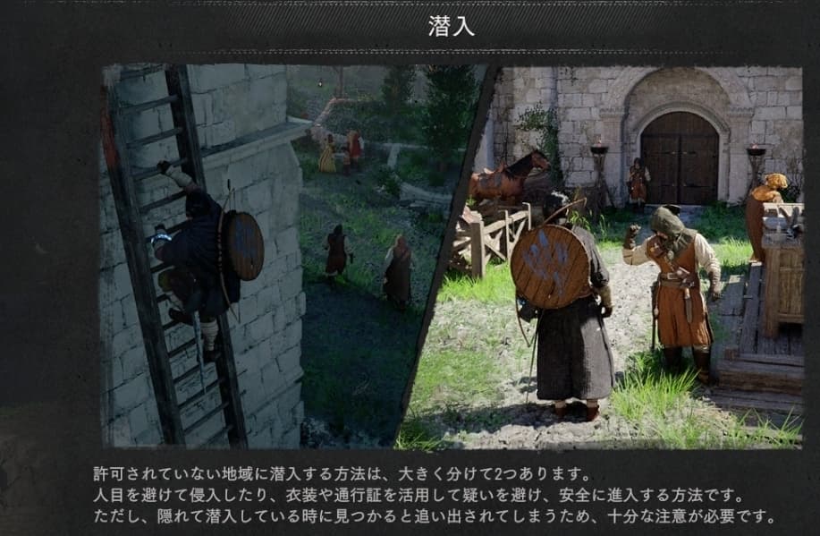潜入する方法もありますが、今回は通行証と衣装の2種類の入り方について紹介していきます。