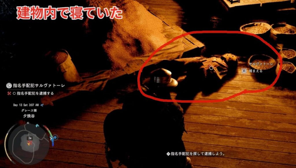 筆者の場合AM3:00に向かった際に村の奥の建物内で寝ていました(倒れている?)