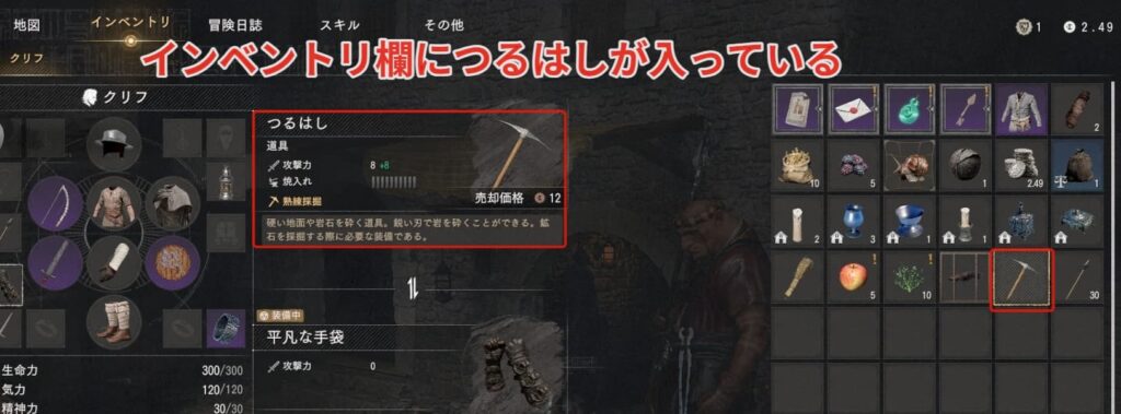 レットから頼み事を受けるとインベントリ欄につるはしが入っています。
