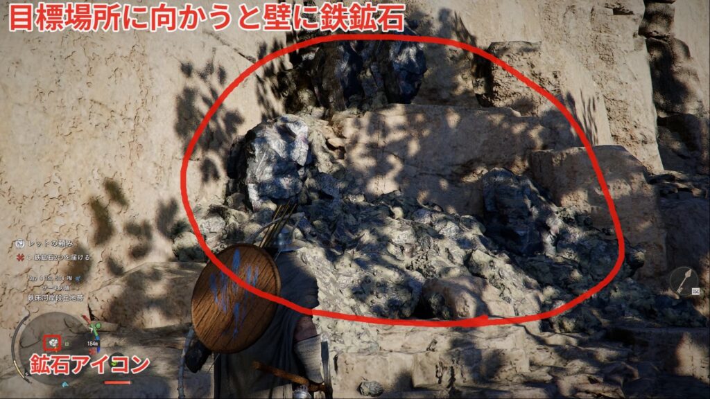 目標場所に近づくと壁の鉄鉱石をみつけることができます。(マップにも鉱石アイコン)