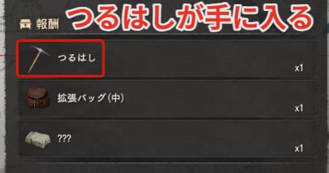 クエストクリア後に報酬でつるはしや拡張バッグが手に入ります。