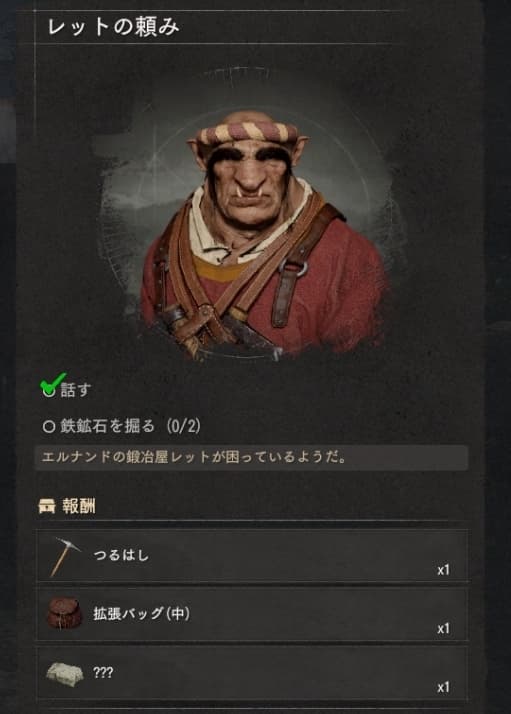 - ②エルナンドの装備商人【レット】に話しかけてクエストを受ける(つるはし貰える)
