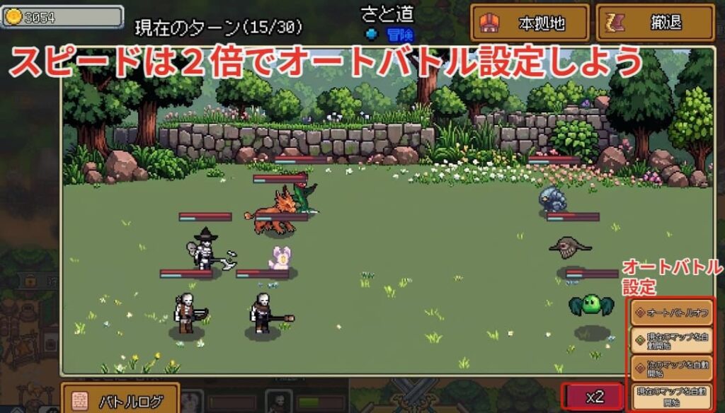 オートバトル時でも上部の本拠地でショップ等利用できるので活用しましょう。