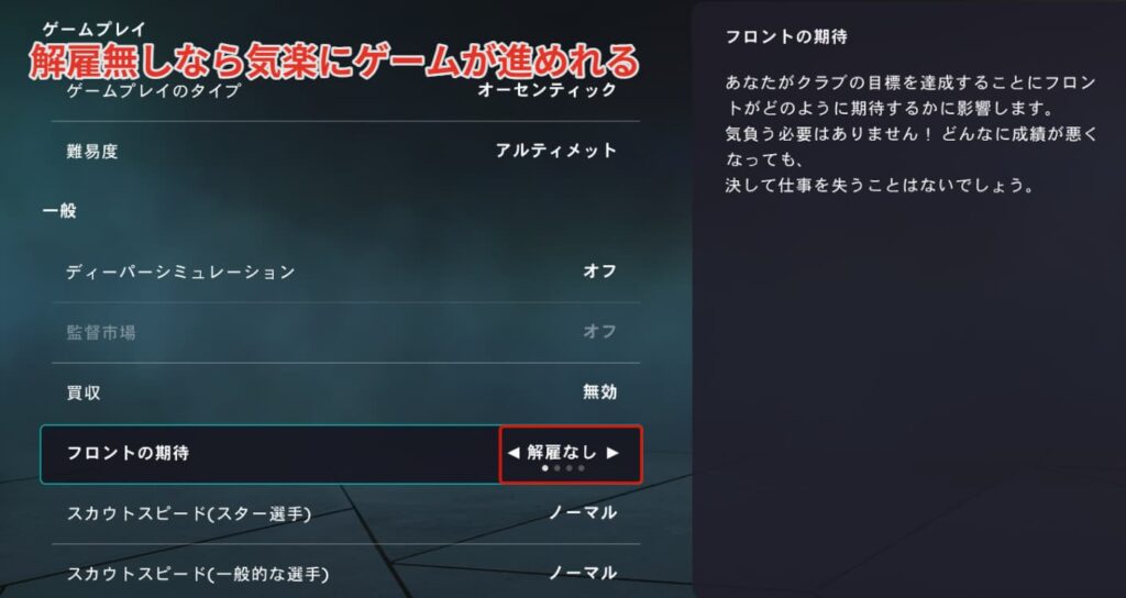 初心者は気楽にゲームができるように解雇なしで進めていきましょう。