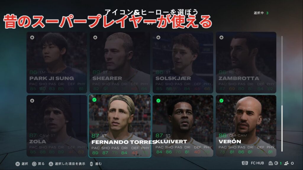 こちらは昔いたスーパープレイヤーを選んだチームで使えるようになります。