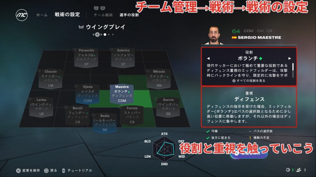 チーム管理→戦術→戦術の設定で選手のゲーム内での役割を変更できます。