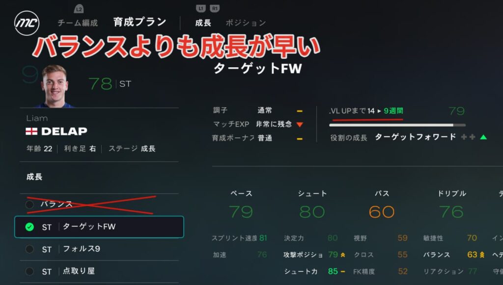 選手の育成プランはバランスよりも他の項目の方が成長速度が速くなります。