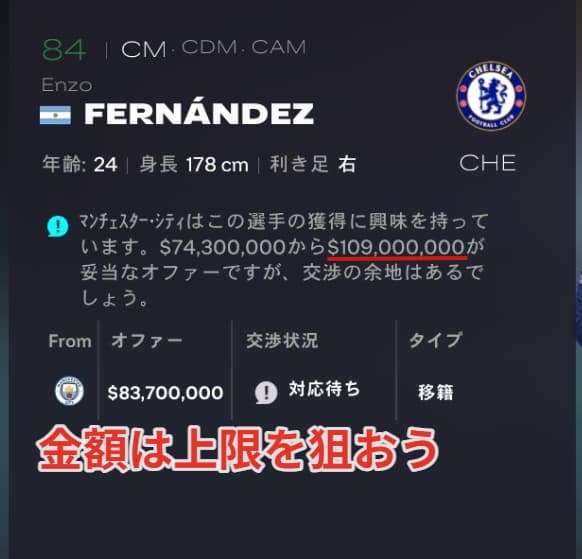移籍時はメッセージで$〇〇~$〇〇が妥当とある程度の目安を示してくれます。