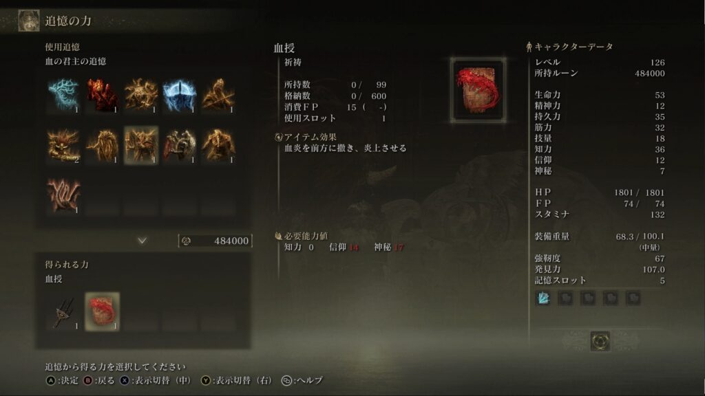 追憶を装備や魔術に変換するには円卓にいるエンヤに話しかけましょう!