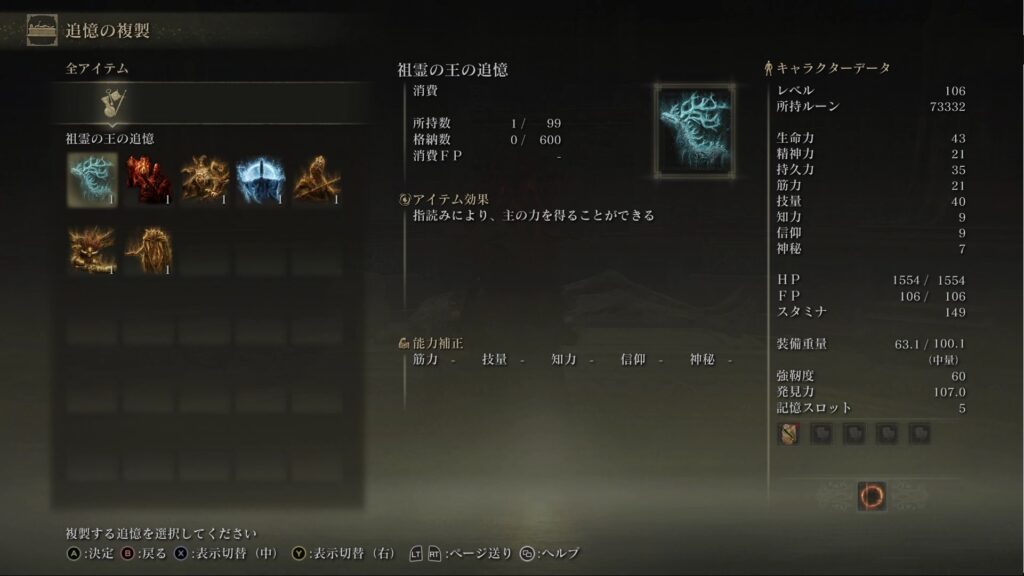 ↑同じアカウントの鐘有と鐘無の複製画面、鐘がついていない霊廟ではゴドリック等の複製が出ていない。代わりに火の巨人と祖霊の王の追憶のみ複製できる。