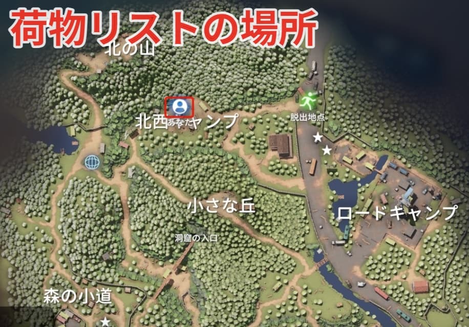 荷物リストは北西キャンプ内のコンテナにあります。