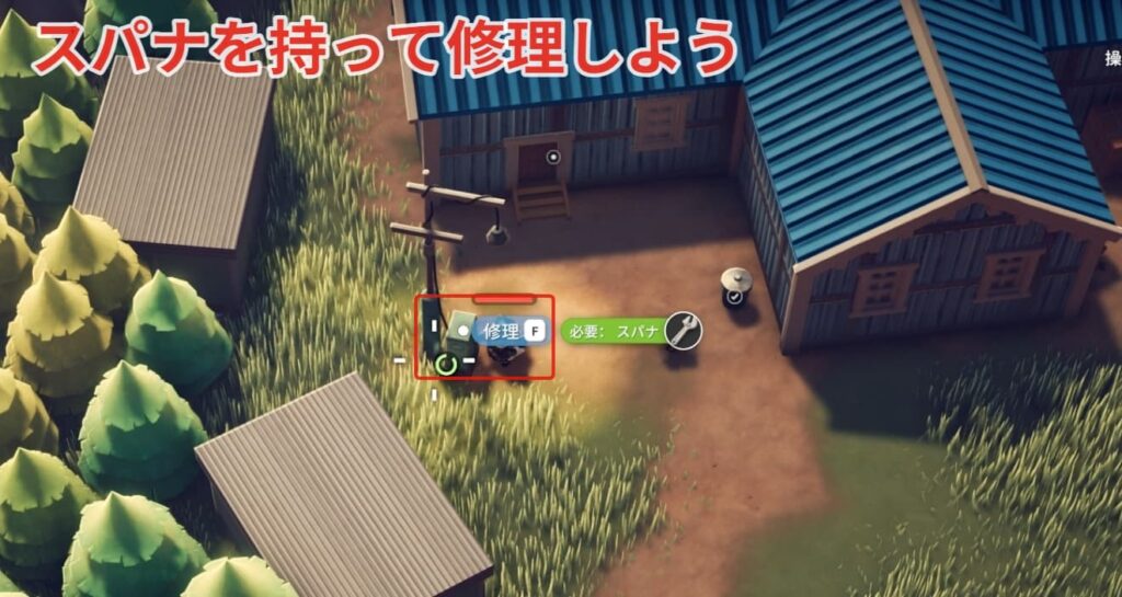 スパナを持って入口の手前にある配電盤を修理しましょう。