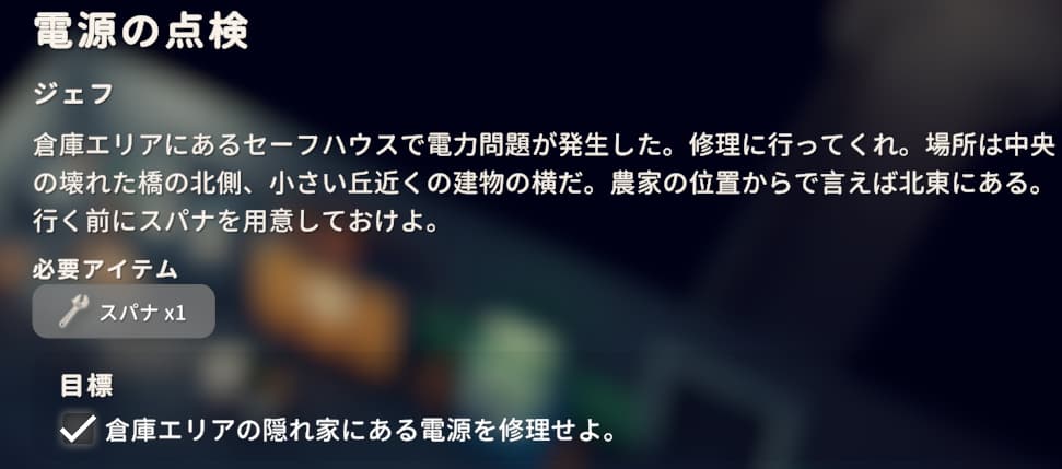 エスケープフロムダッコフの【クエスト:電源の点検】について紹介していきます。