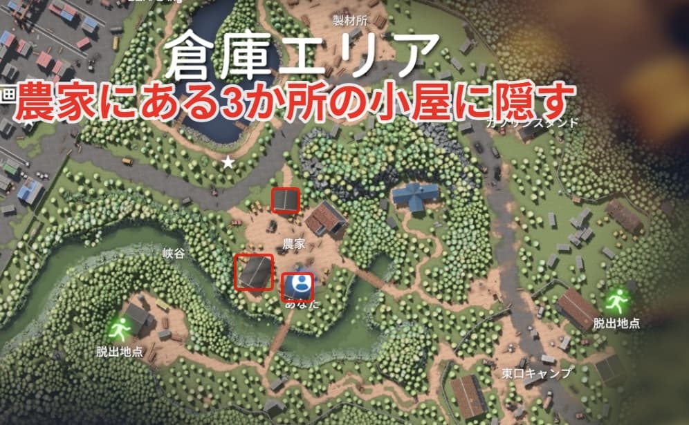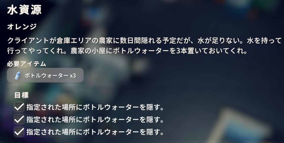 農家にある3か所の小屋にボトルウォーターを3つ持って隠しにいきましょう。