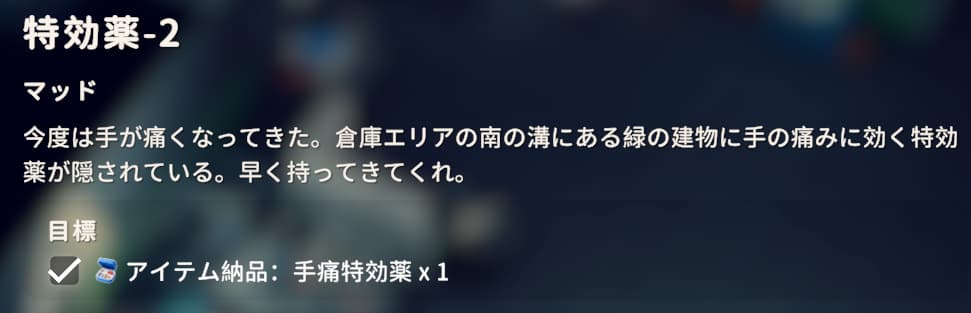 エスケープフロムダッコフの【クエスト:特効薬-2】について紹介していきます。