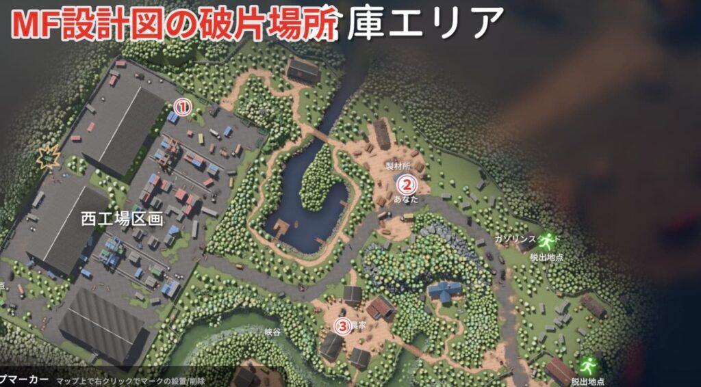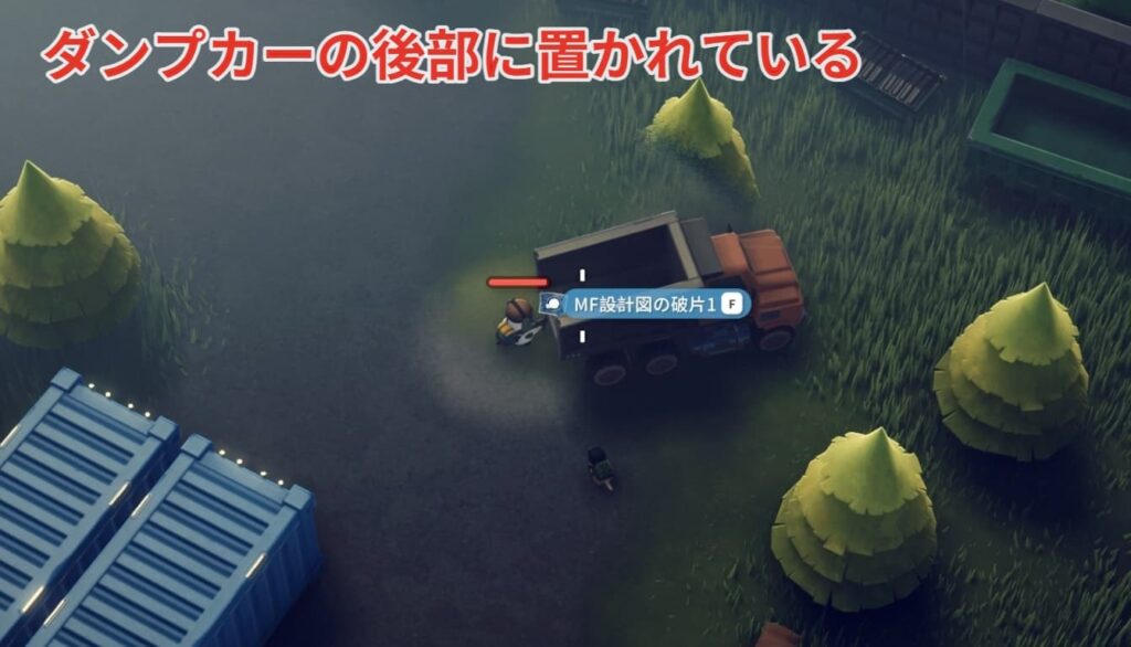 MF設計図の破片は画像の①②③の場所にあるダンプカー後部に置いてあります。