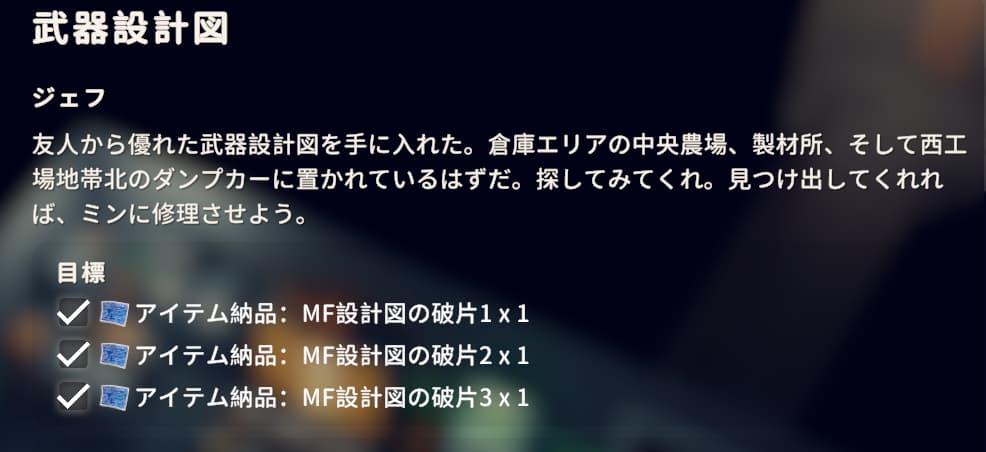 エスケープフロムダッコフの【クエスト:武器設計図】について紹介していきます。