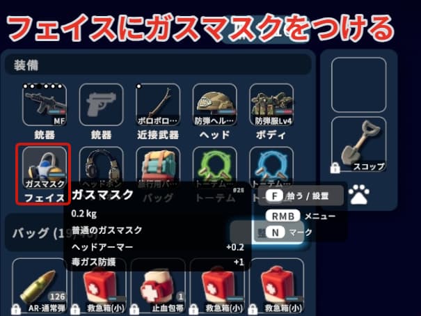 ガスマスクを手に入れたらフェイスにガスマスクを装備しましょう。