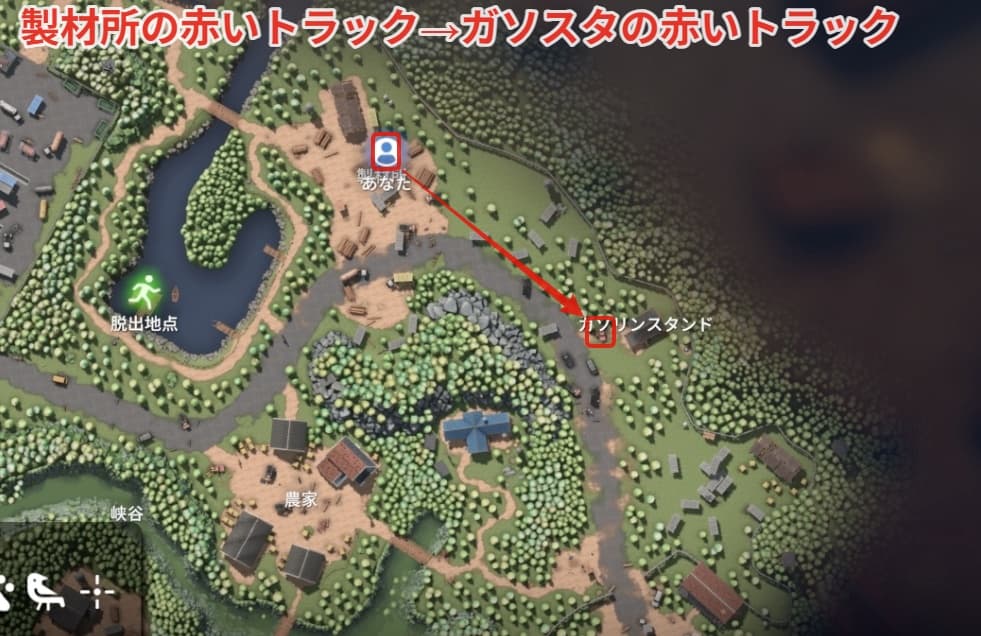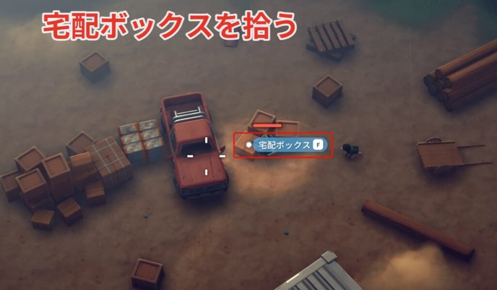 製材所のにある赤いトラックで宅配ボックスを拾ってガソスタの赤いトラックまで運びましょう。