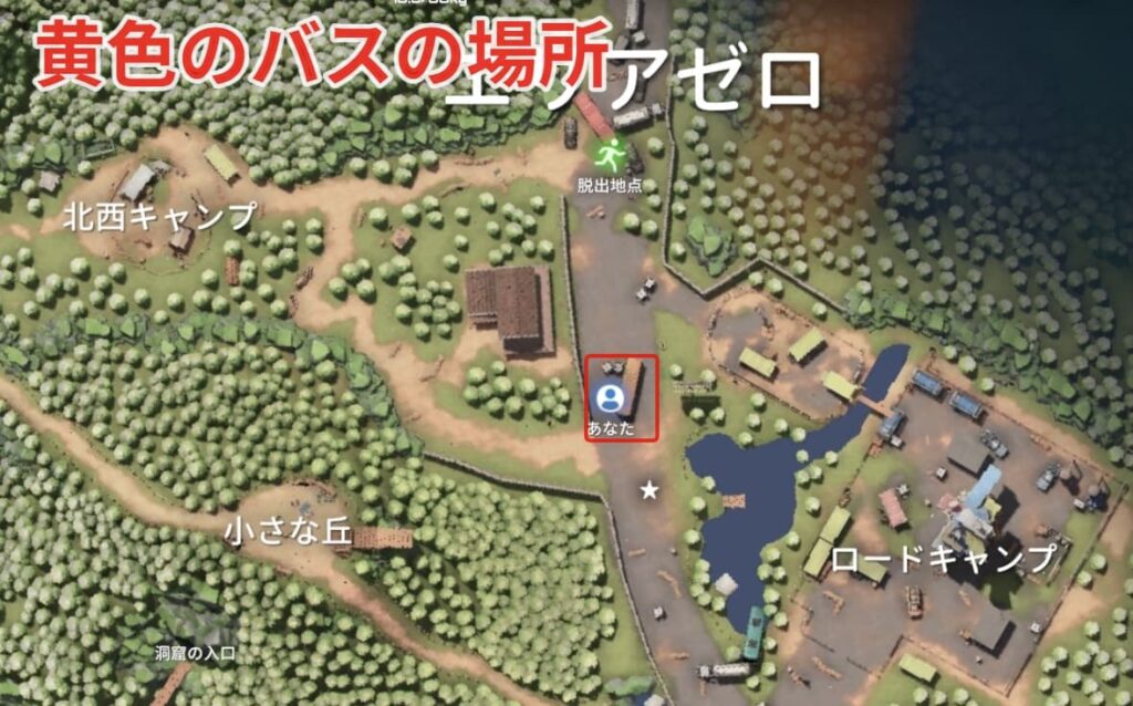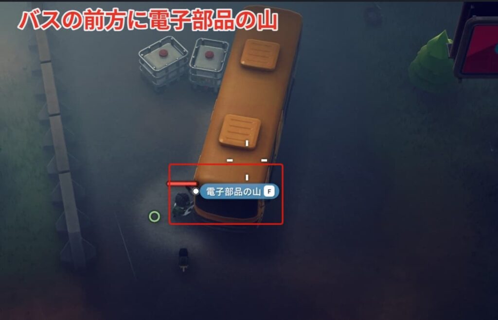 電子部品の置いてある黄色いバスはロードキャンプに繋がる大きい道を進んだ先にあります。