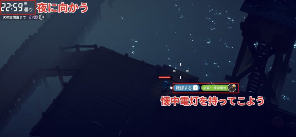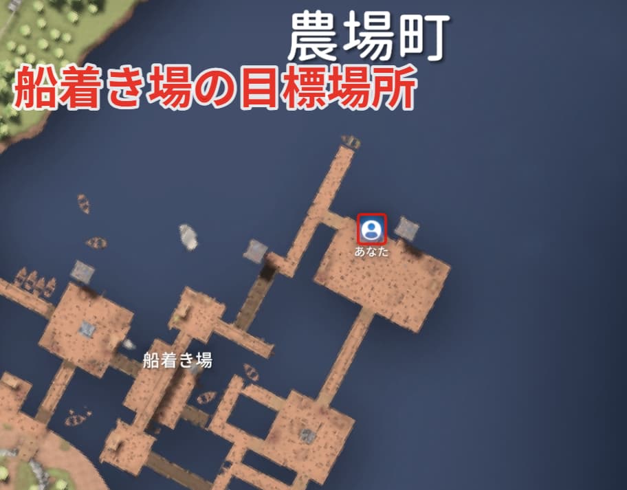 クエストで時間が指定されているので夜間の22:00~5:00に船着き場に向かいましょう。