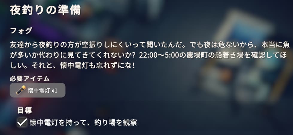 指定場所で懐中電灯が必要なので、手に入れてからクエストに挑みましょう!