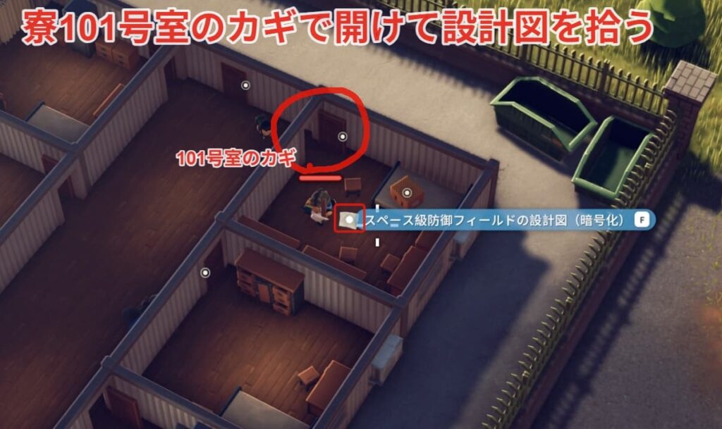 101号室をカギで開けて設計図を持ち帰ればクリアです。