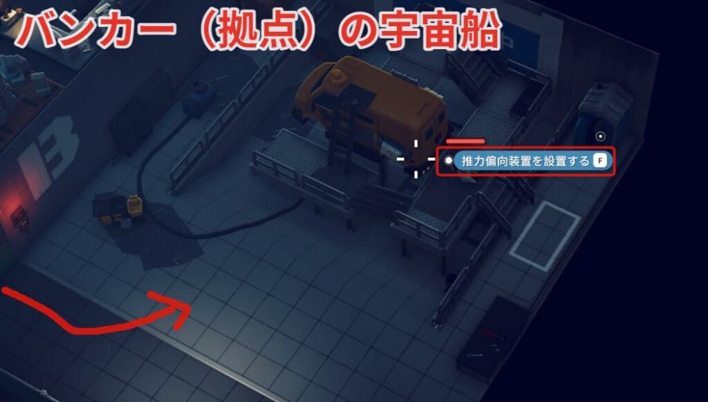 バンカー(拠点)の右側の通路から宇宙船にアクセスできます。装置を設置しましょう!